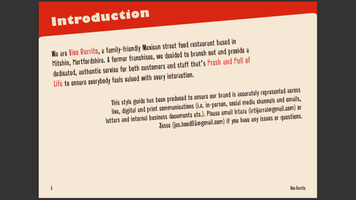 I partnered with another student, producing brand assets, a branding guideline document and promotional material to propose the launch of Vivo Burrito, a rebrand of the Plan Burrito Mexican restaurant in Hitchin.