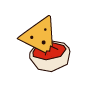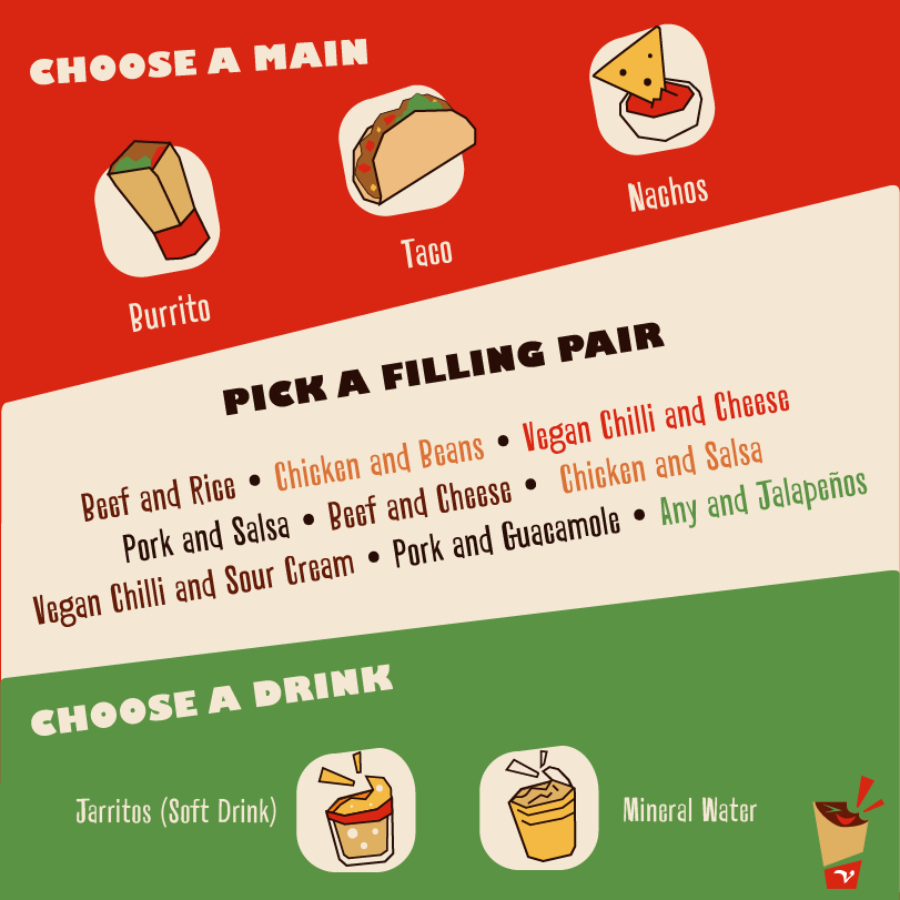 Food/menu icons (burrito, taco, nacho, churro with chocolate dip, juice and water)