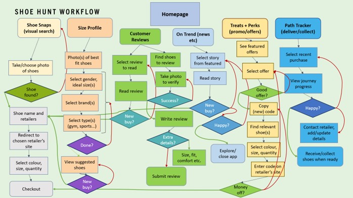 My app concept, titled Shoe Hunt, proposes the use of a phone’s camera or photos to identify newfound shoes or suggest similar alternatives, as well as custom profiles to show users recommended shoes and outfits from a range of retailers.
